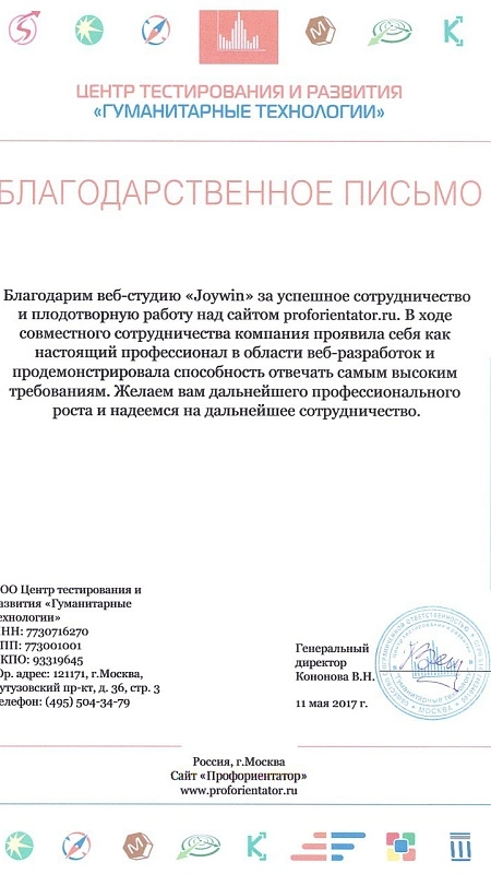ЦТР «Гуманитарные технологии» выражает искреннюю благодарность веб-студии JoyWin за плодотворное сотрудничество, которое длится уже несколько лет. За это время было создано два масштабных проекта, на регулярной основе проводятся работы по отдельным задачам.