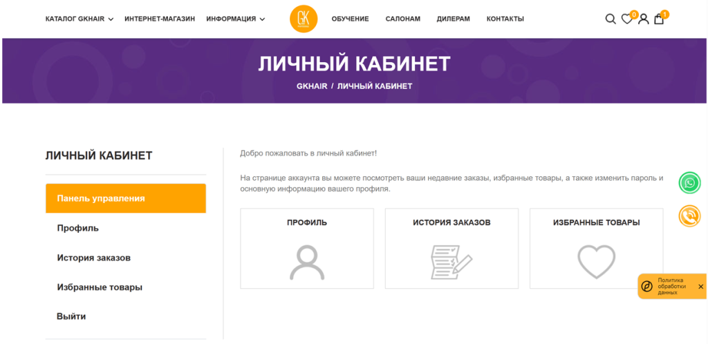 - личный кабинет розничного клиента: