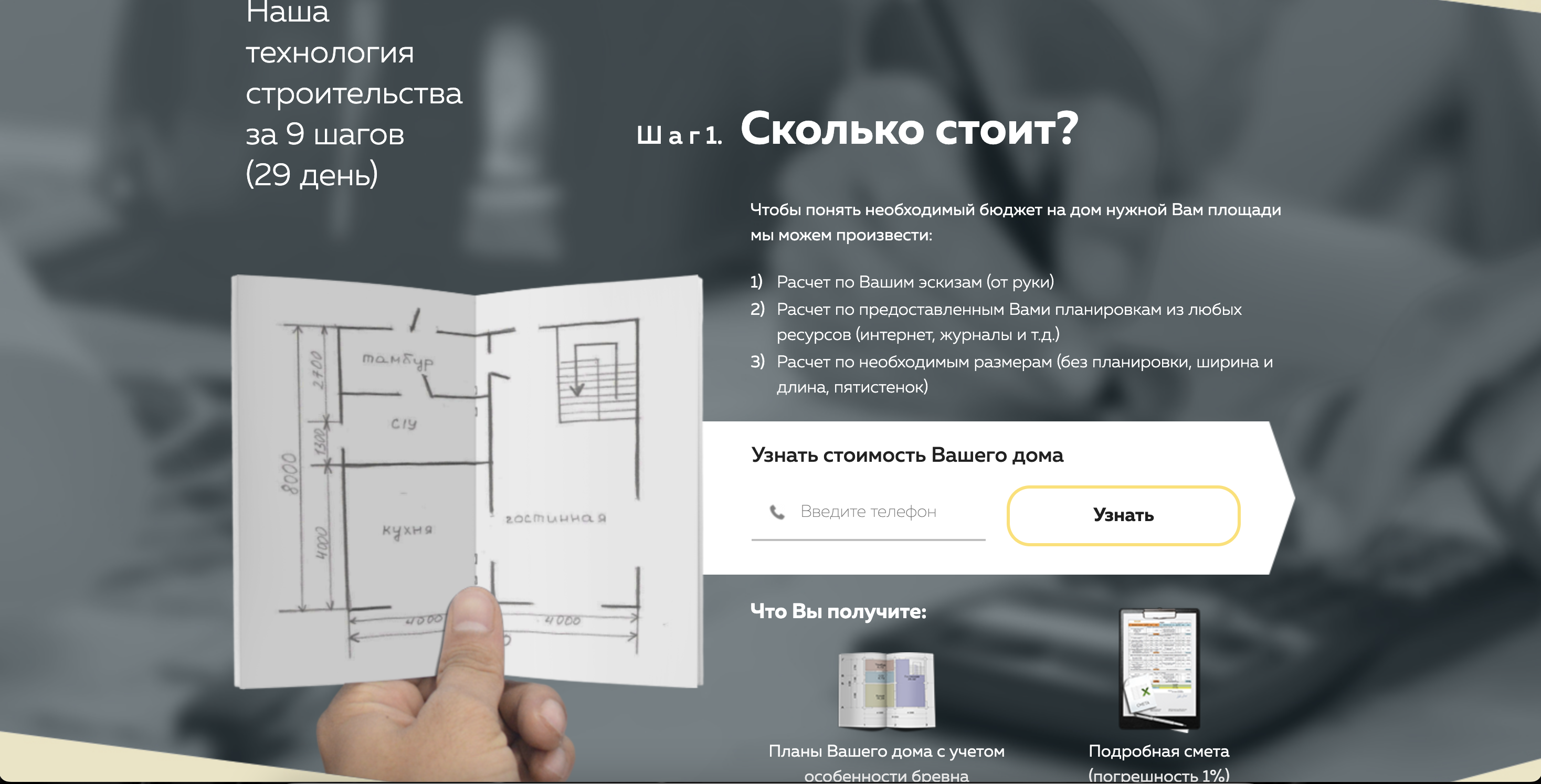 Разработали дизайн-концепт в стиле эко-минимализма: светлый фон, акценты на фактуре дерева, крупные фото построек.