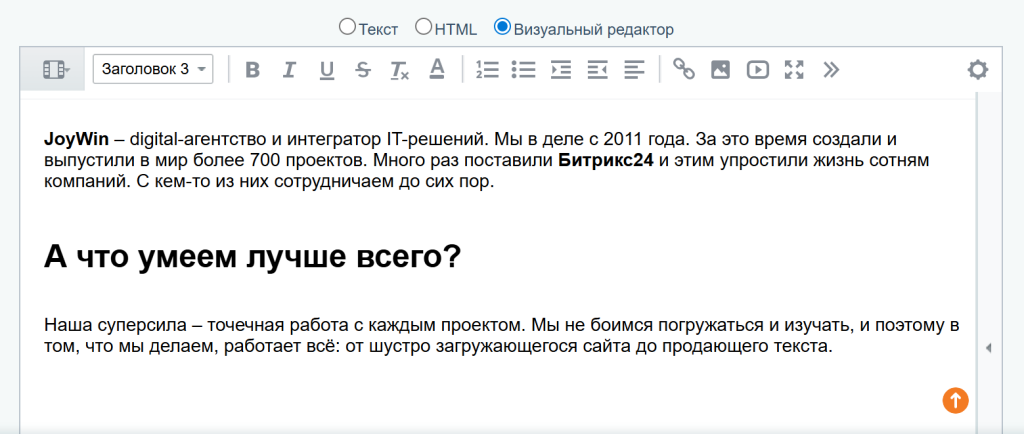 Мы настроили в админ-панели редактор WYSIWYG. Он понятный и удобен для создания контента и редактирования страниц.