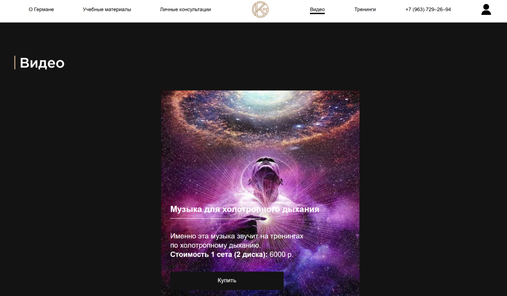 🔵 «Видео» — раздел с описанием музыки для холотропного дыхания, кнопка «купить»);